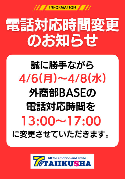 外商BASEの電話対応時間を 13:00~17:00 に変更させていただきます。