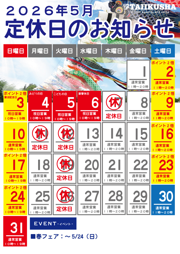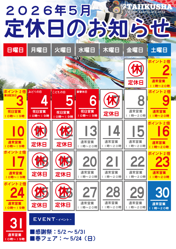 2026年5月の店舗定休日をお知らせいたします。